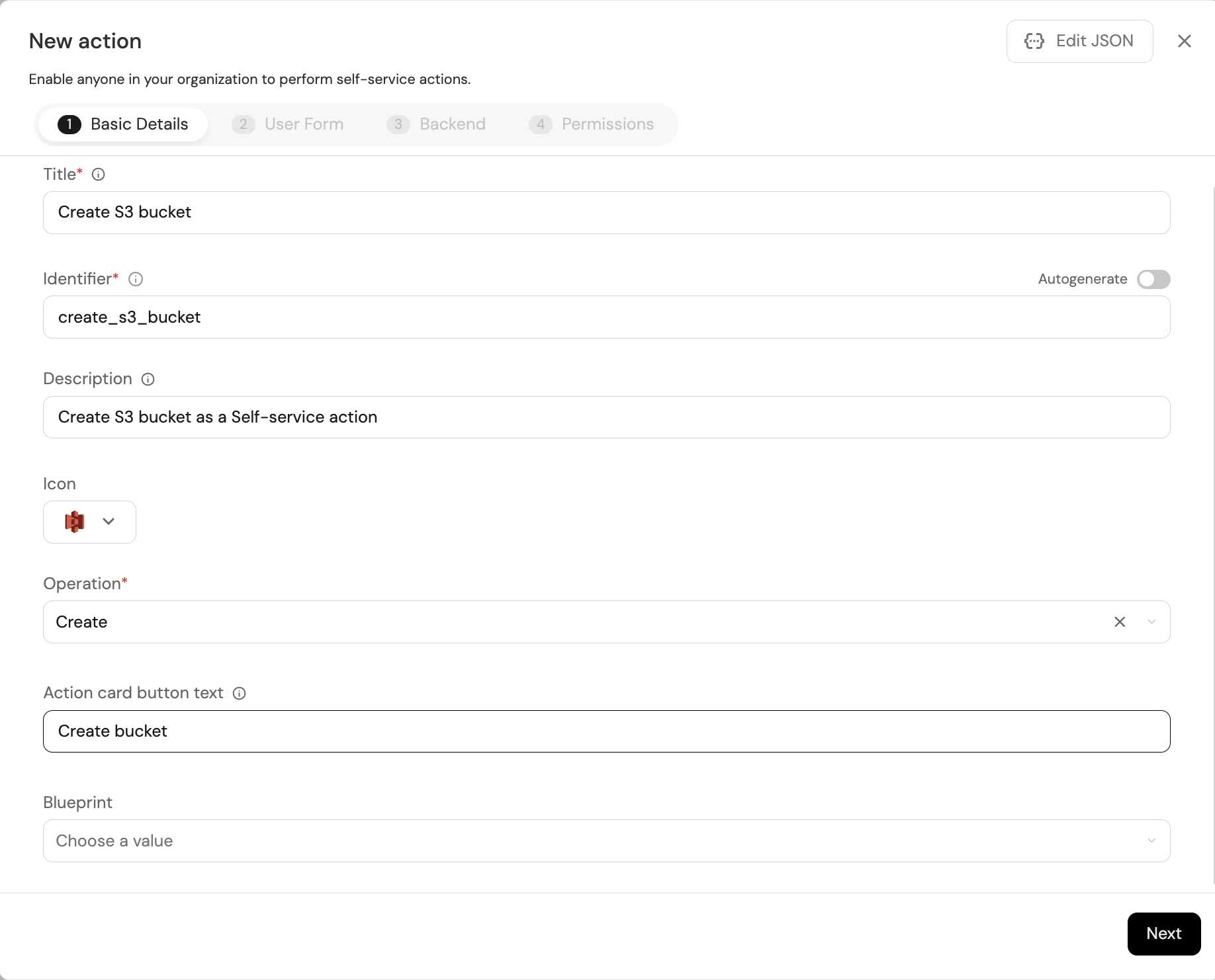 After selecting the blueprint you want to add an action to, we need to define the action's frontend - its structure and interface.