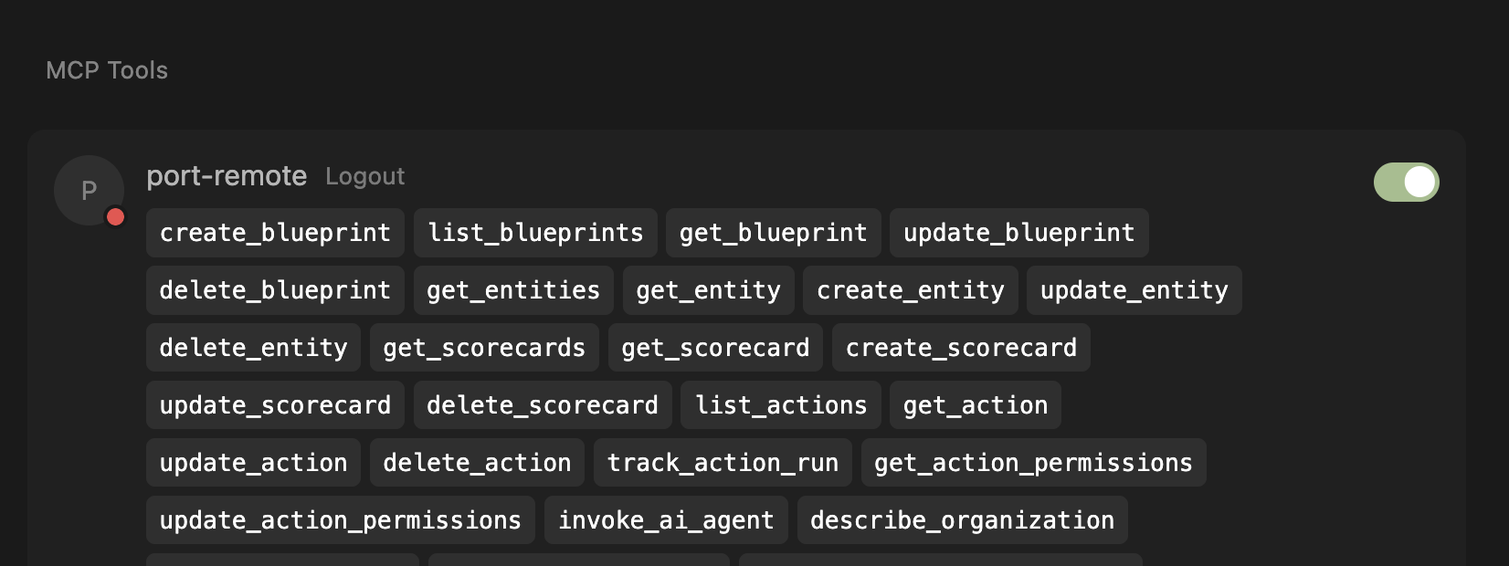 Each self-service action in your Port instance becomes an individual tool (as run_<action_identifier>). If your organization has many actions, this can result in a large number of tools being available.
