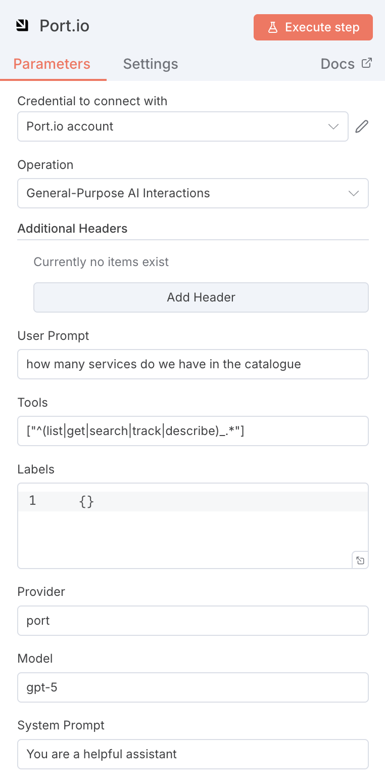 Configure the Port node — In the General Purpose AI Interaction node: