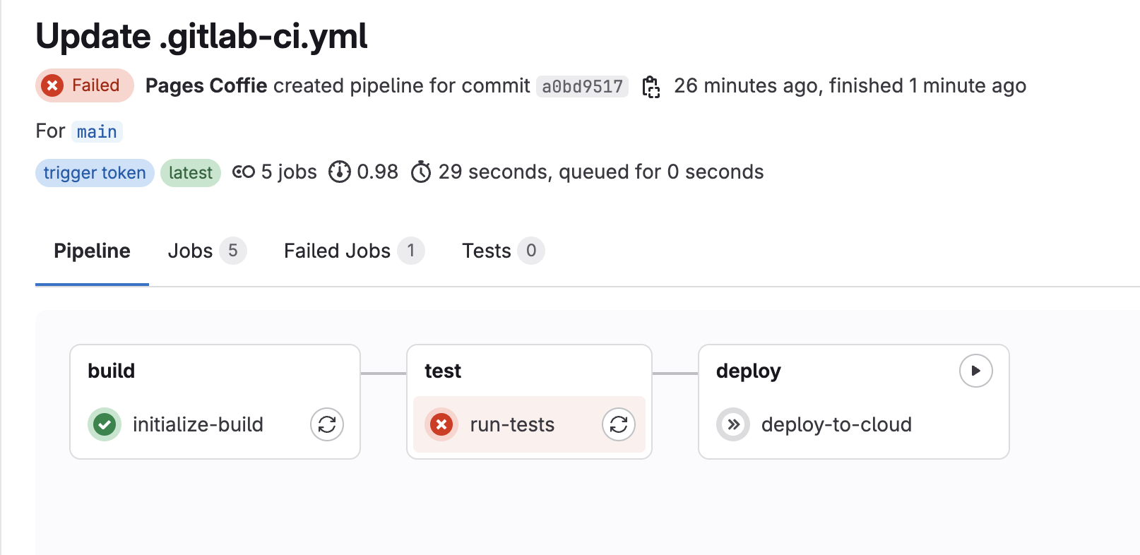 A GitLab pipeline will be triggered but will fail on the test stage due to not meeting coverage threshold