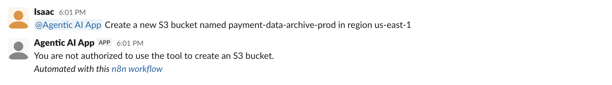runtime_nameproperty in yourrbacToolentities matches the tool names used in your n8n workflow (e.g.,calculator,wikipedia,Create_an_incident_in_PagerDuty,Create_a_bucket_in_AWS_S3).