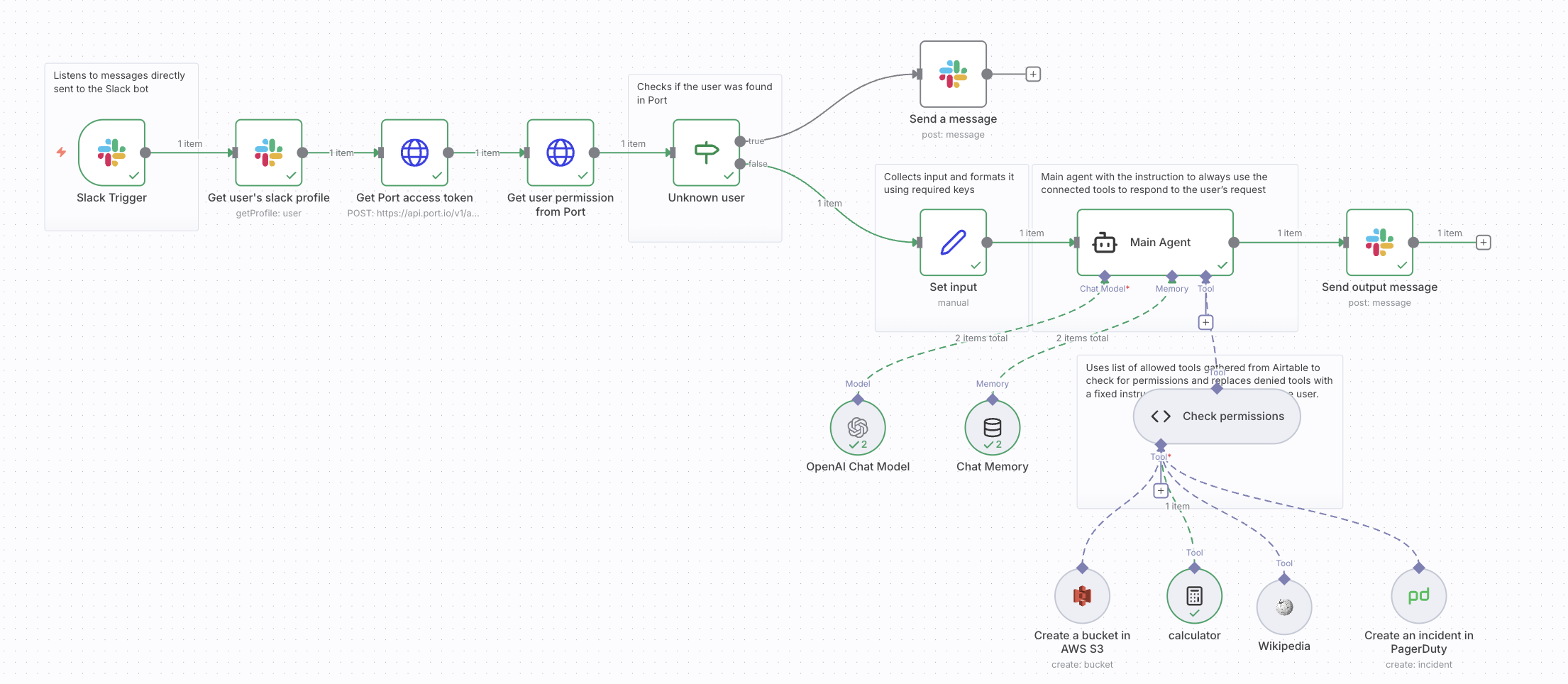We will create an n8n workflow that uses Port as the RBAC source of truth. The workflow will trigger when a user sends a message to the AI agent via Slack, query Port for the user's permissions, and dynamically filter tools based on those permissions.