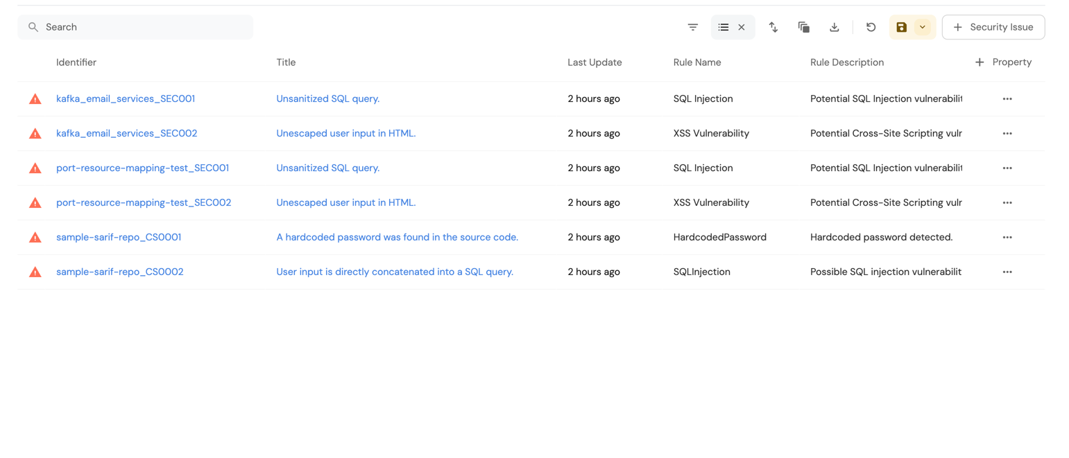 Once you have configured the data source and mappings, the extracted security issues will appear in the Port UI with properties like rule name, description, location, and message. Hereβs an example SARIF file structure that you can copy and replicate for testing purposes: