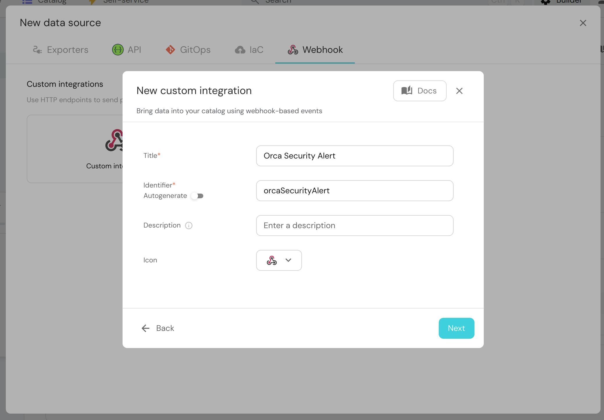 Note: Copy the webhook URL displayed by Port in the next step, you'll need it to set up webhooks on the Orca Security side.