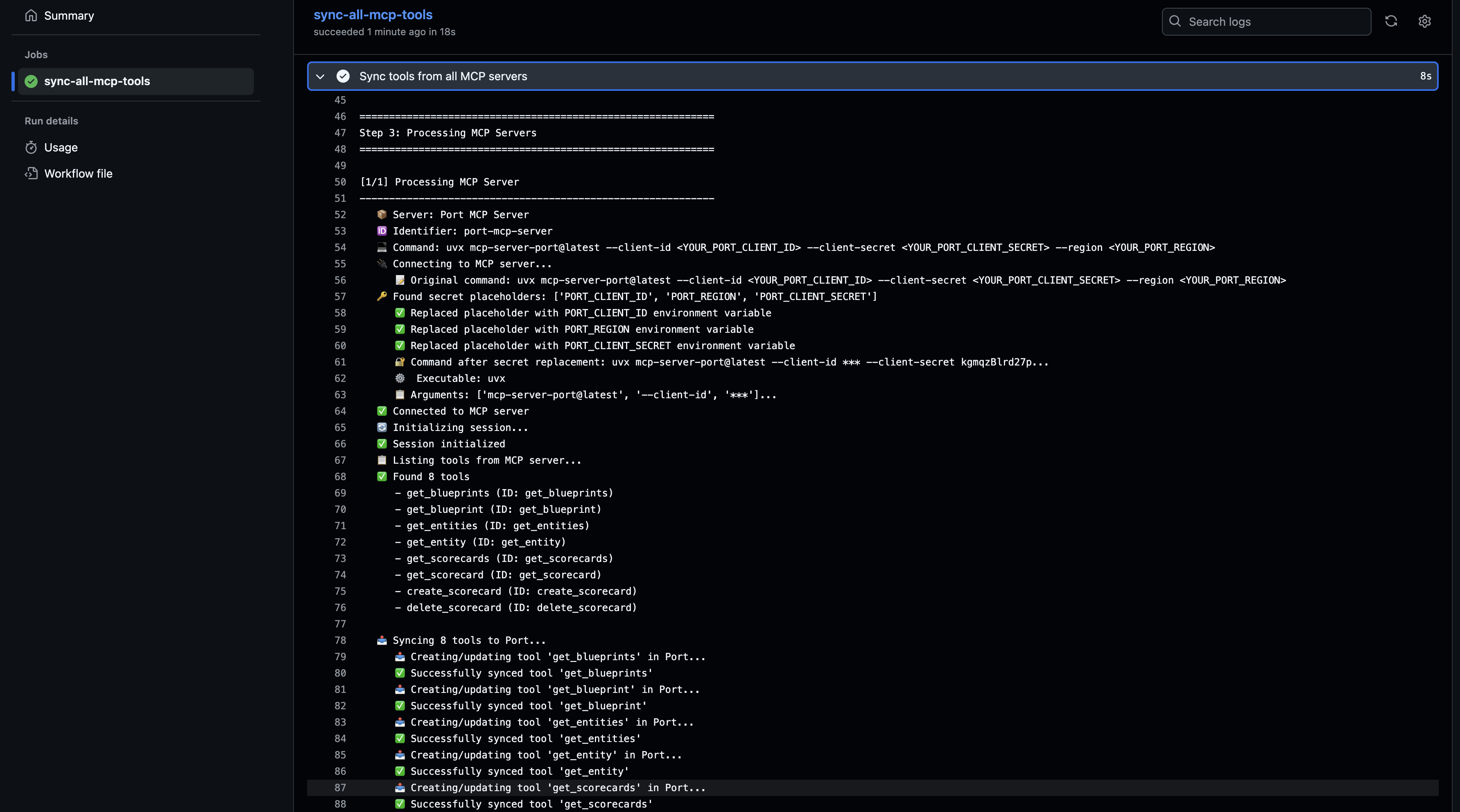 YOUR__SECRET_NAMEor<YOUR_SECRET_NAME>with environment variable values - Creates or updates tool entities in Port's