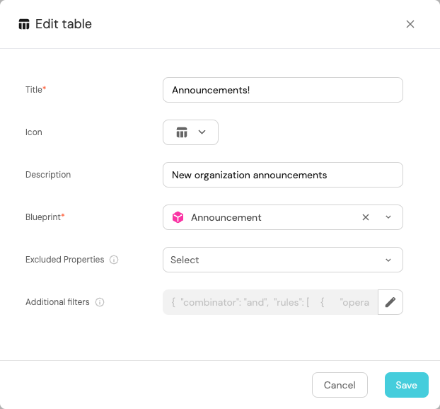 A convenient way to display announcements is in the portal's homepage, which serves as a dashboard. You can do this by creating a table widget that lists all announcements.
