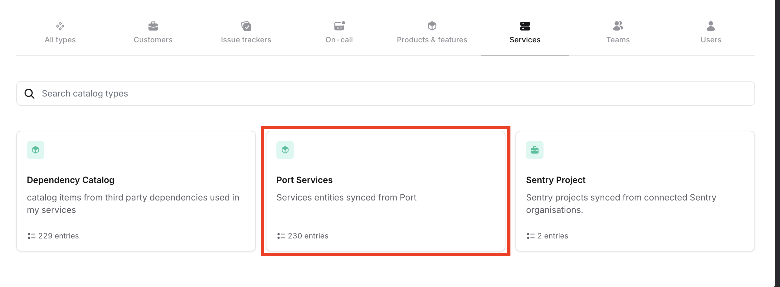 Port Servicescatalog type or any custom name you provided. - You should now see the synced service entities from Port listed under this catalog type.