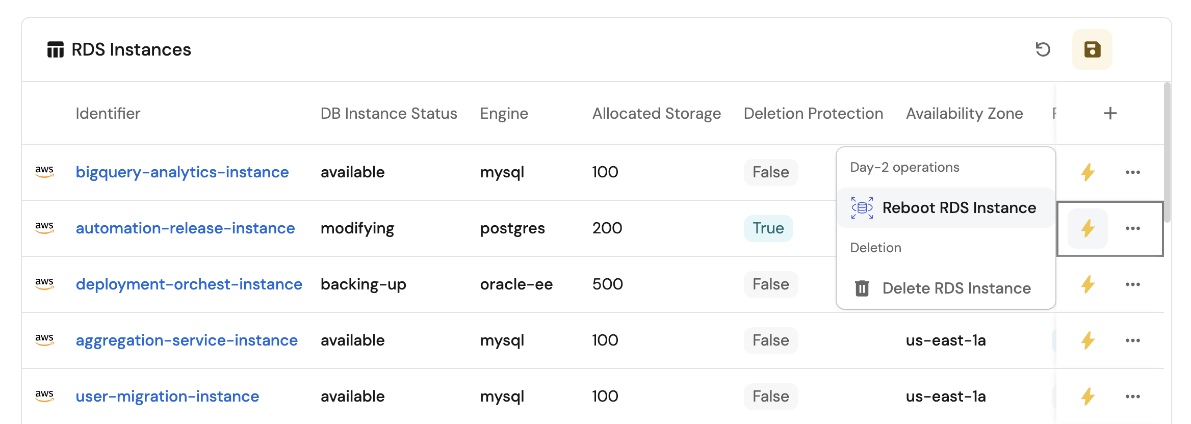 - Set up self-service actions to manage RDS instances (reboot and delete).